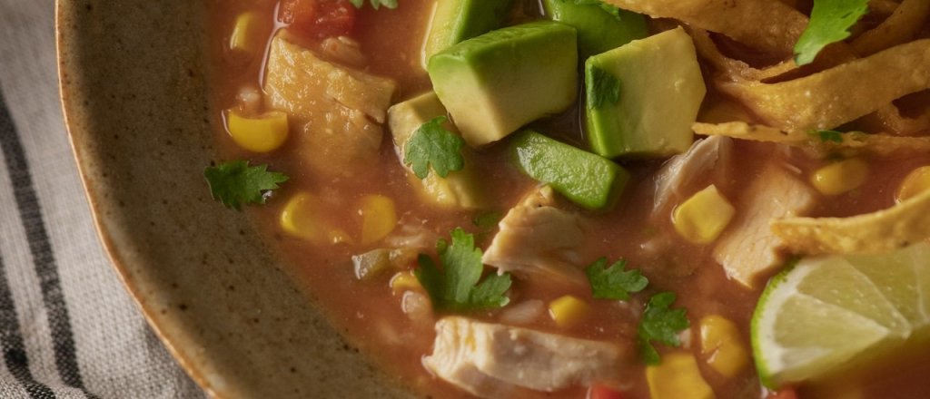 Scalda l’olio in una casseruola da 3 litri a fuoco medio-alto. Aggiungi mais, pepe e peperoncino in polvere e cuoci per 2 minuti. Mescolare il pollo.
